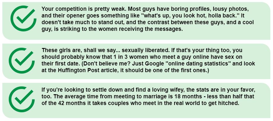 I was VERY unsure about trying anything online, but work was slow that week and I thought what the hell, can't hurt and I can always ask for my money back. It took me about 20 minutes to get a profile set up, and another ten to browse and pick some girls to message. And just like you described happened to you, as soon as those first messages came back, I was HOOKED. This is some seriously ninja-level stuff you've put together. I'm no longer stressed when I go to the bar with friends because I know there are girls waiting at home, and my wit and banter have gotten better thanks to all the practice I get online. Easily the best program I've bought. Thanks Race.