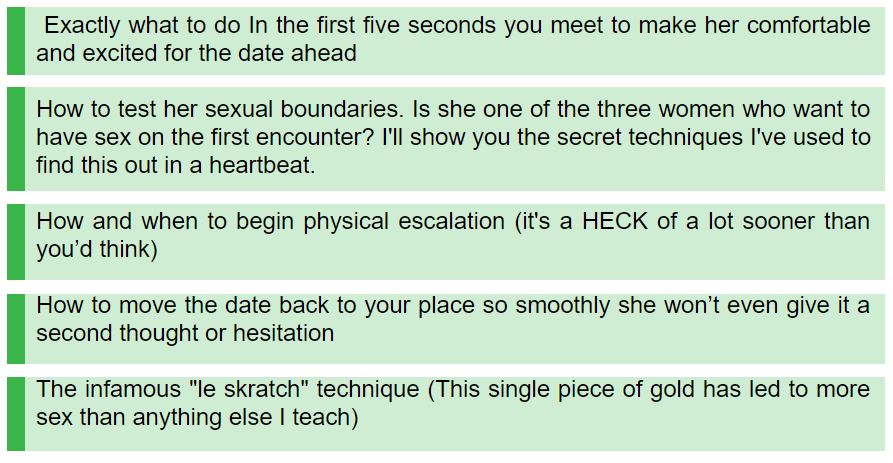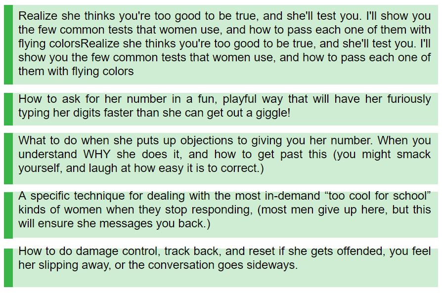 And you're equipped with an arsenal of pre-scripted lines, techniques and back-pocket secrets designed to make getting her on a date as easy as "copy and paste."